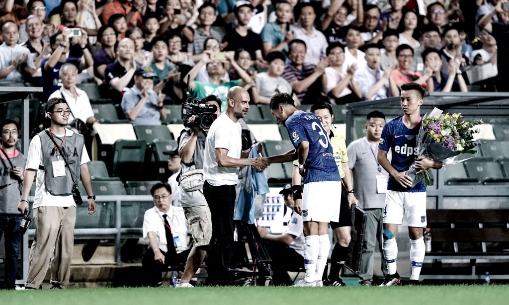Manchester City manager Pep Guardiola caught attention when he presented Kim Dong-jin with a City jersey featuring the number 38 and the name “KIM DJ” as he exited the pitch after being substituted.